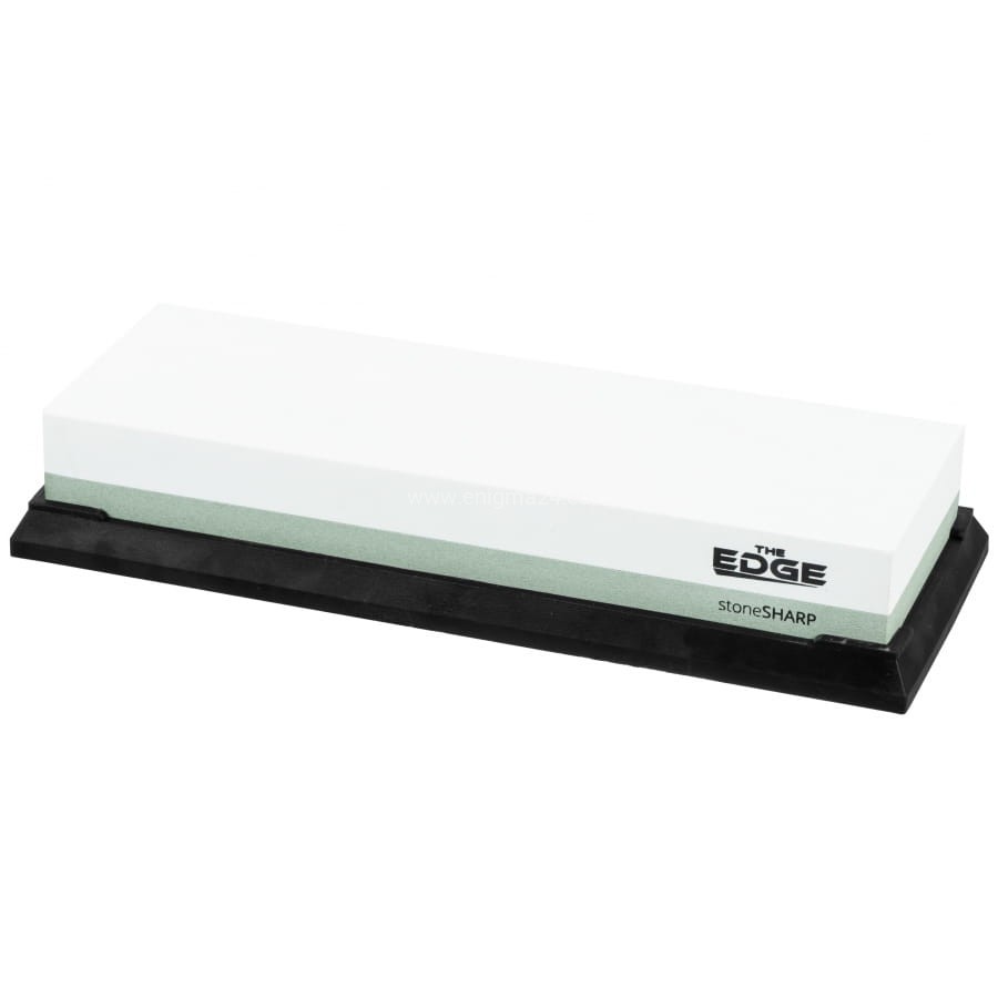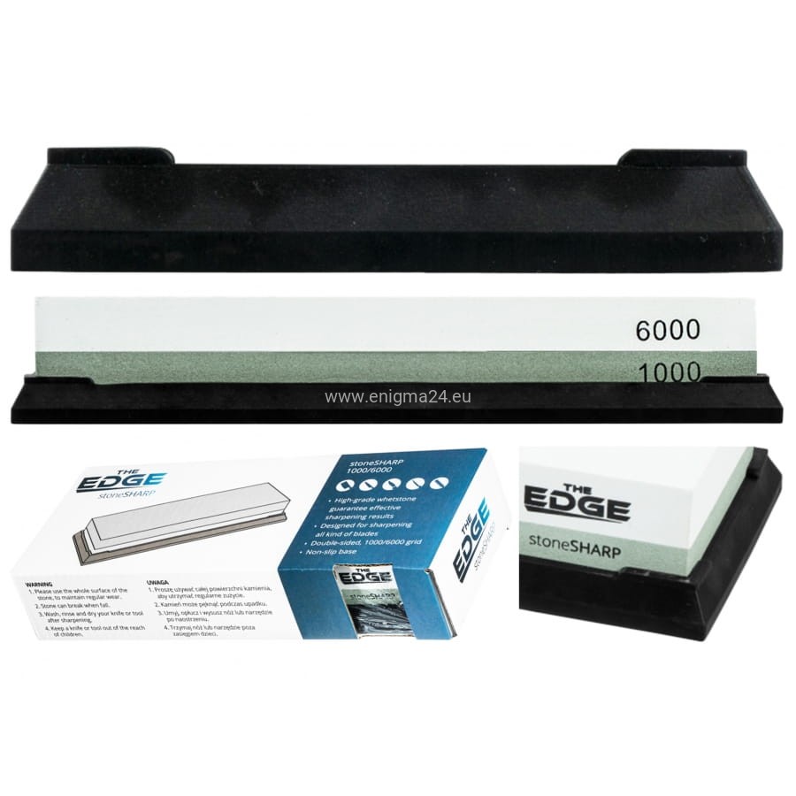 THE EDGE stone SHARP 1000/6000 to dwustronny kamień wodny z korundu, który przy odpowiedniej wprawie pozwala nadać nożowi perfekcyjnej ostrości. Kamień ma dwie gradacje tj. fine 1000 (ciemnoszarą) przeznaczoną do szybkiego podostrzania i wygładzania oraz ultra fine 6000 (białą) do ostrzenia właściwego oraz szybkiego podostrzania lekko stępionych narzędzi. Gradacje 1000 i 6000 świetnie sprawdzą się do polerowania noży kuchennych, brzytew oraz narzędzi, którym chcemy nadać idealną ostrość.Duża powierzchnia (180×60 mm) sprawia, że na kamieniu możemy komfortowo ostrzyć także duże narzędzia np. siekiery, maczety.